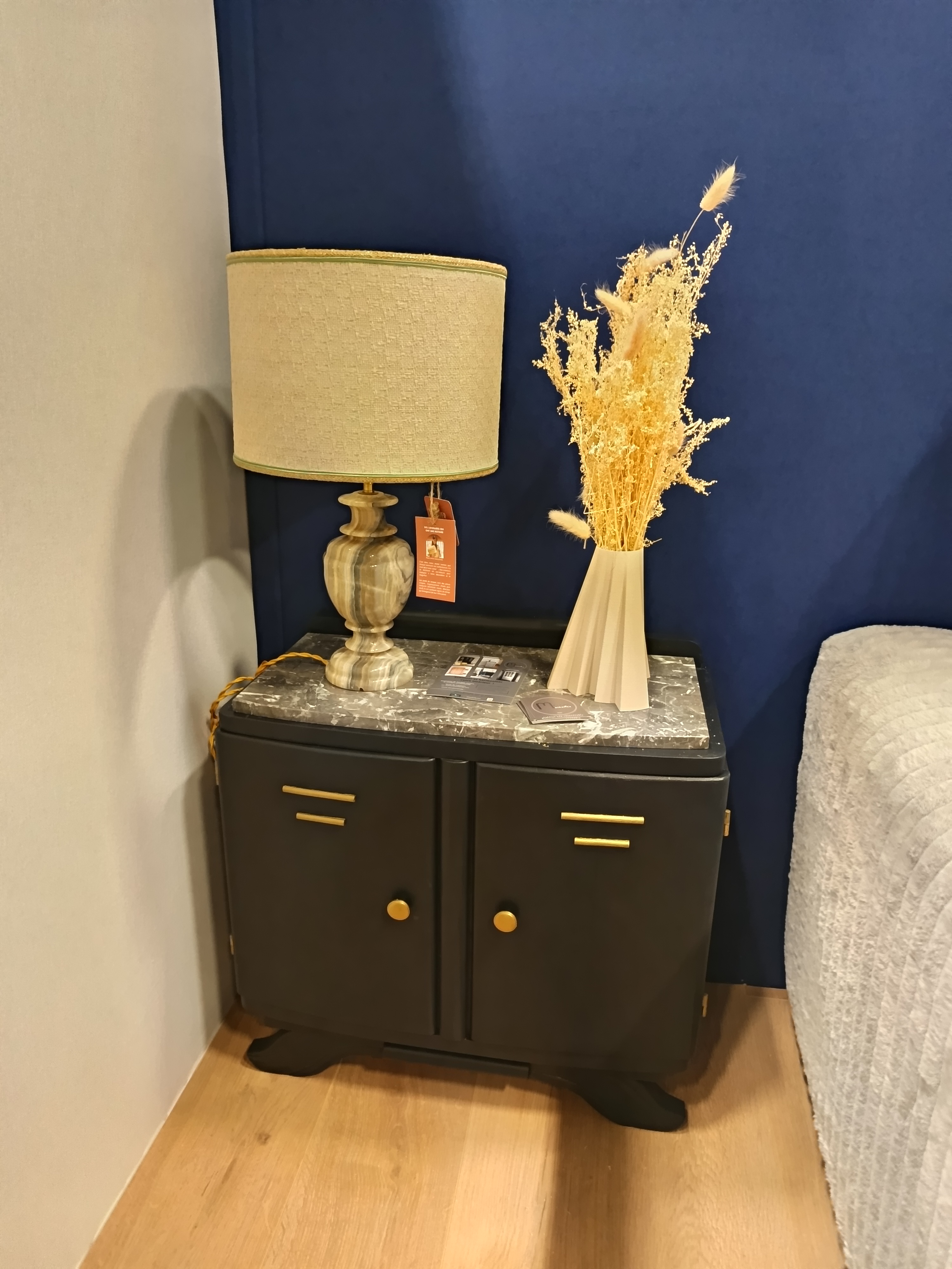 Ce joli duo de chevets vintages a été rénové en noir et doré, sublimé dans les petits tiroirs par un papier peint art déco.